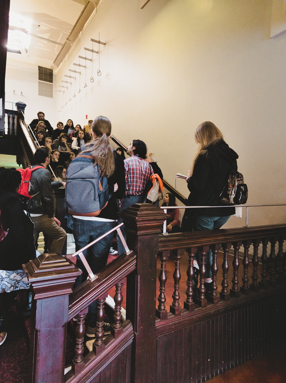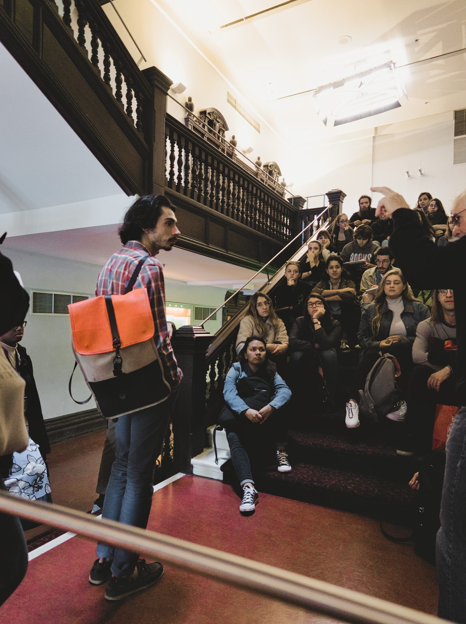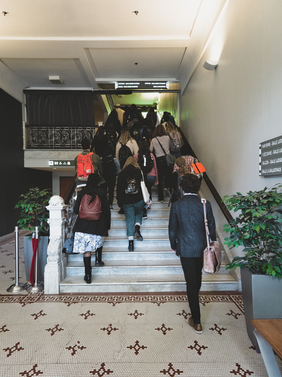 Sur la photo : des escaliers plutôt exigus permettent de descendre au bas de la salle et contrastent avec le large escalier à l’entrée du bâtiment. S’y sent-on moins à l’aise ou en sécurité? Les concepteurs de la salle s’en sont-ils souciés?
