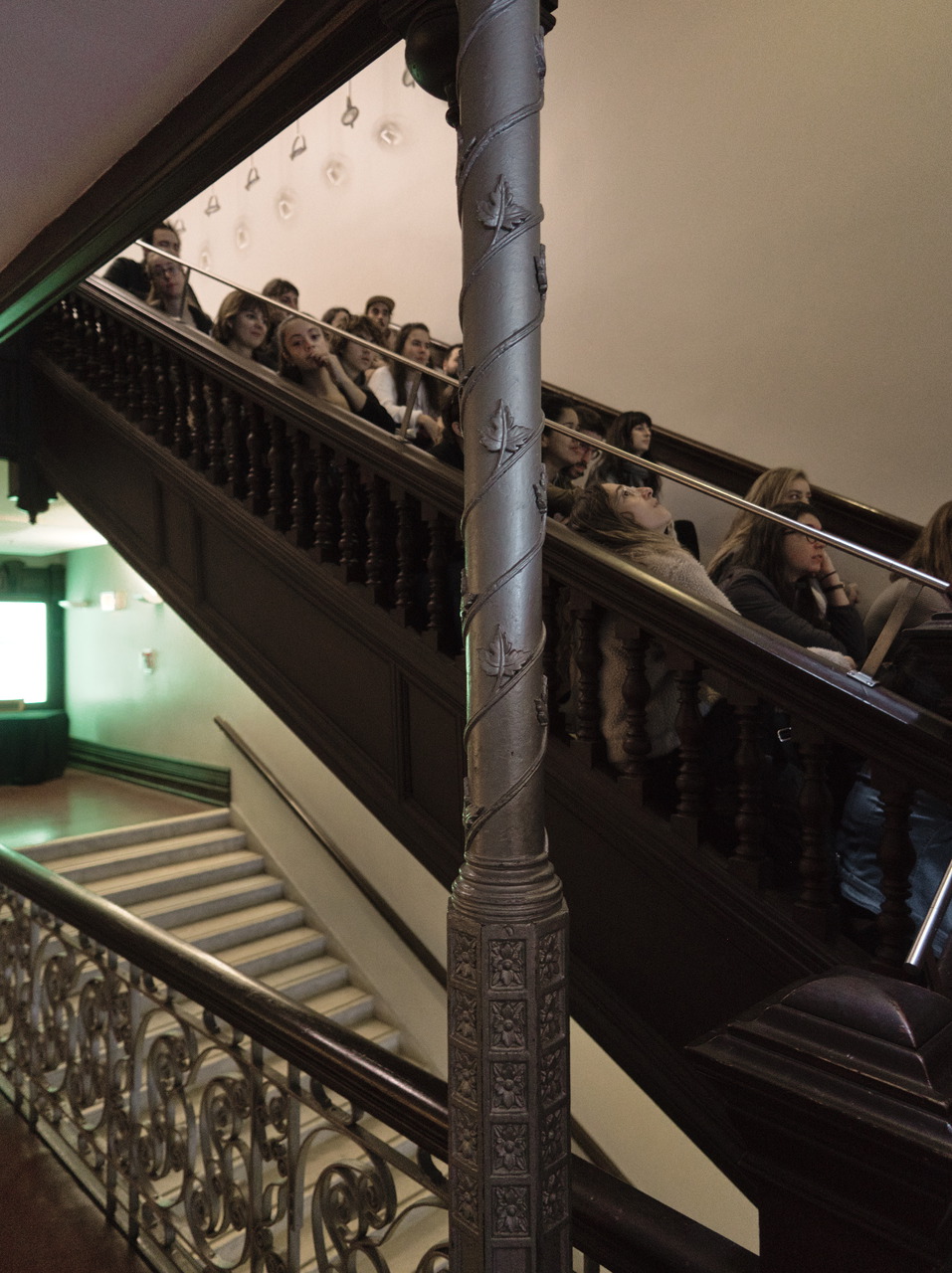 Le large escalier était autrefois réservé à la bourgeoisie (la classe populaire empruntait un ancien escalier exigu à l’arrière du bâtiment, à partir de la rue Clark).